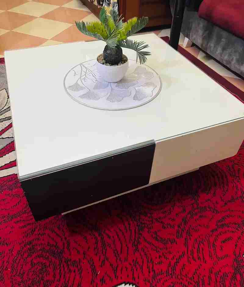 تربيزة مربعه بني ب ابيض سطح زجاج بوحدات تخزين