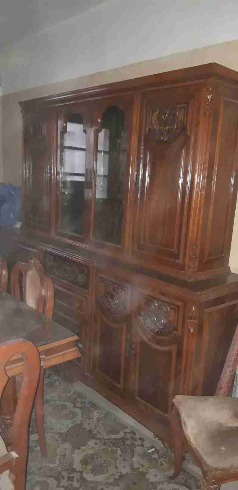 سفره خشب زان اصلي ممتاز معرض الالفي بدمياط نيش وترابيزة سفره ب ٦ كراسي ودولاب هدايا والرف زجاج خشب ممتاز تقيل
