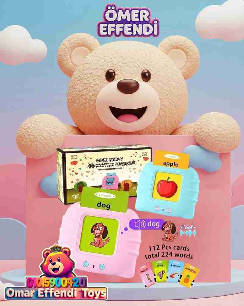 🗣️ جهاز إلكتروني ناطق: بيقرأ محتوى كل كارت بوضوح، مش بس الكلمات، كمان بيطلع أصوات مرتبطة بالكلمات عشان يثبت المعلومة في ذهن طفلك بطريقة مسلية! 📣🐶🚕