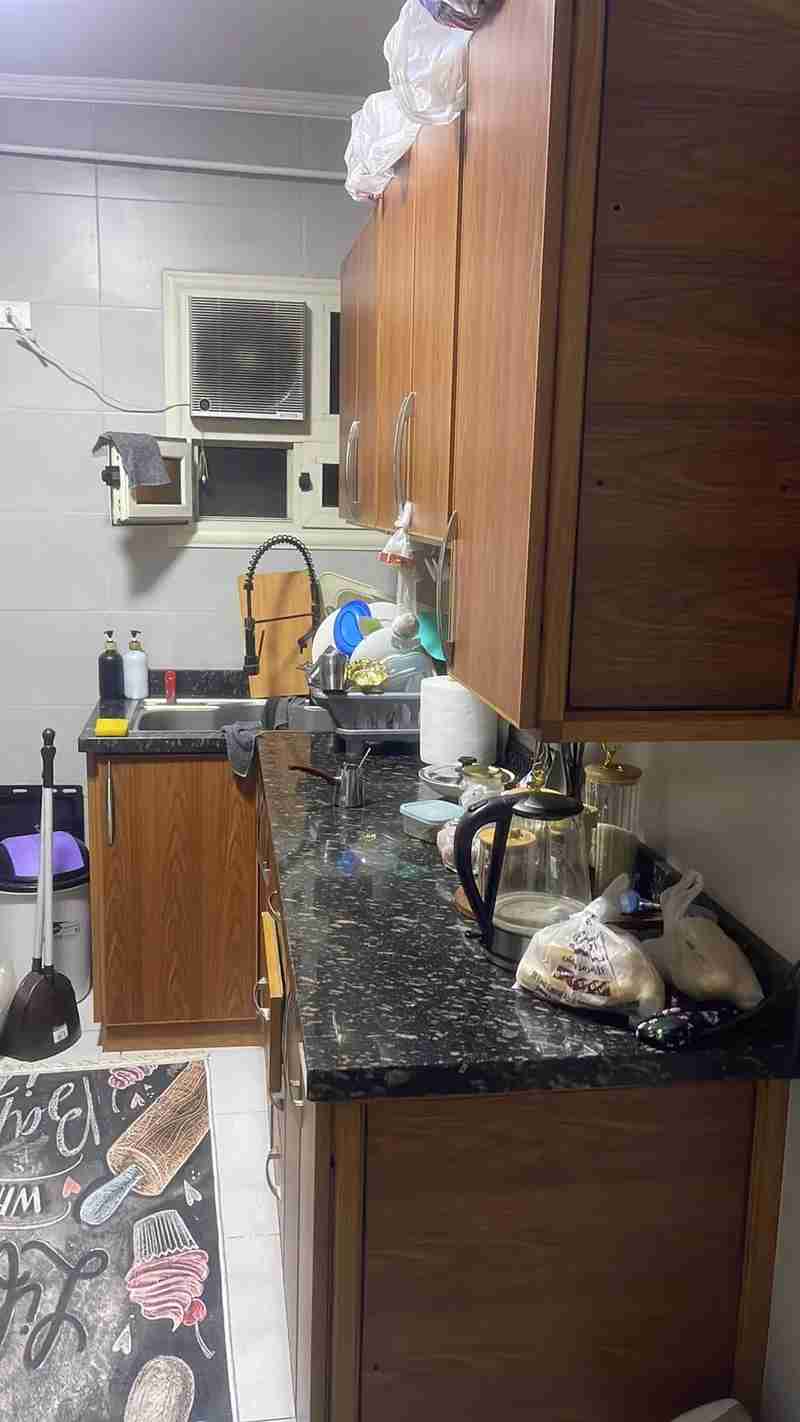 مطبخ خشمونيم يحتوي على قطع ضلفتين وقطع ضلفة وترولي زيوت وصفايه مطبقية استعمال شهور مساحته توتال ٩ متر شامل الرخامة اسواني اصلي
