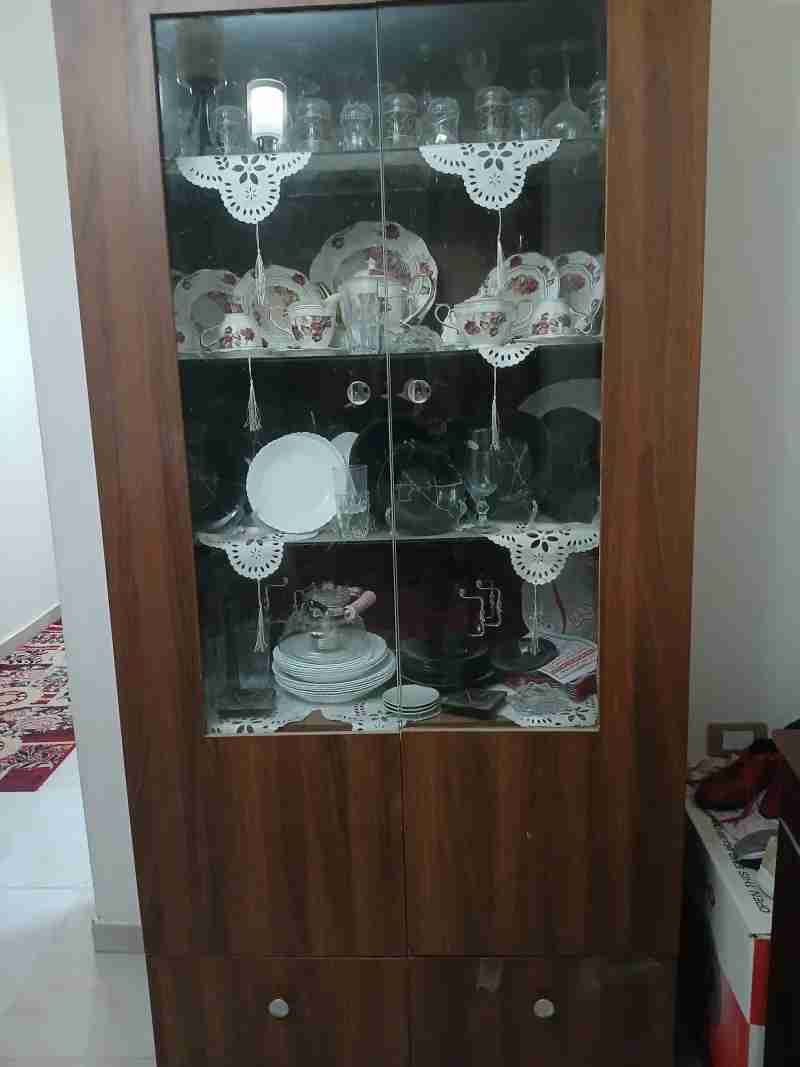 نيش خشب كونتر مكون من ضرفتين وأربع رفوف زجاج ودرجين للتخزين
